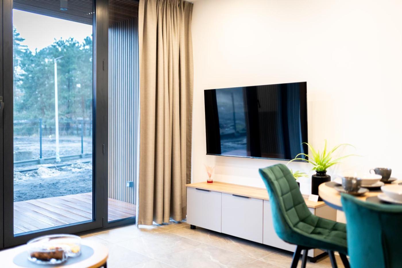 Dom z 2 sypialniami. This air-conditioned holiday home includes 1 living room, 1 separate bedroom and 2 bathrooms with a shower. Guests will find a stovetop, a refrigerator, a dishwasher and an oven in the fully equipped kitchen. The holiday home also features a barbecue. Boasting a terrace with garden views, this holiday home also offers soundproof walls and a flat-screen TV with streaming services. The unit has 2 beds. Dom wakacyjny - 6 osobowy. Powierzchnia pokoju ok.: 55 mkw.
